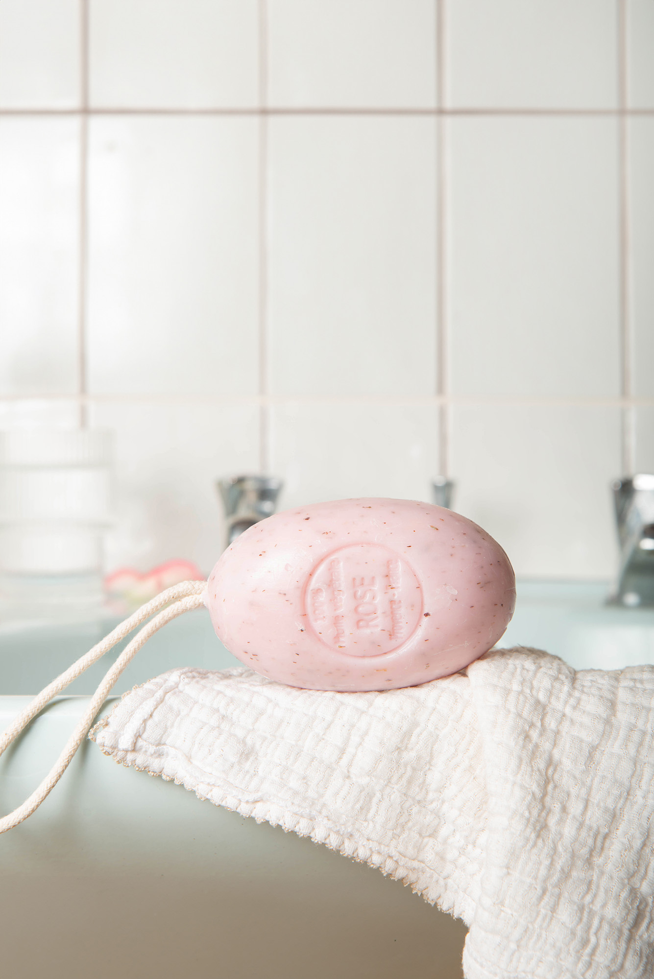 Savon solide ovale sur corde à la rose avec exfoliant 200g, savon artisanal sensoriel pour une toilette florale et délicatement stimulante